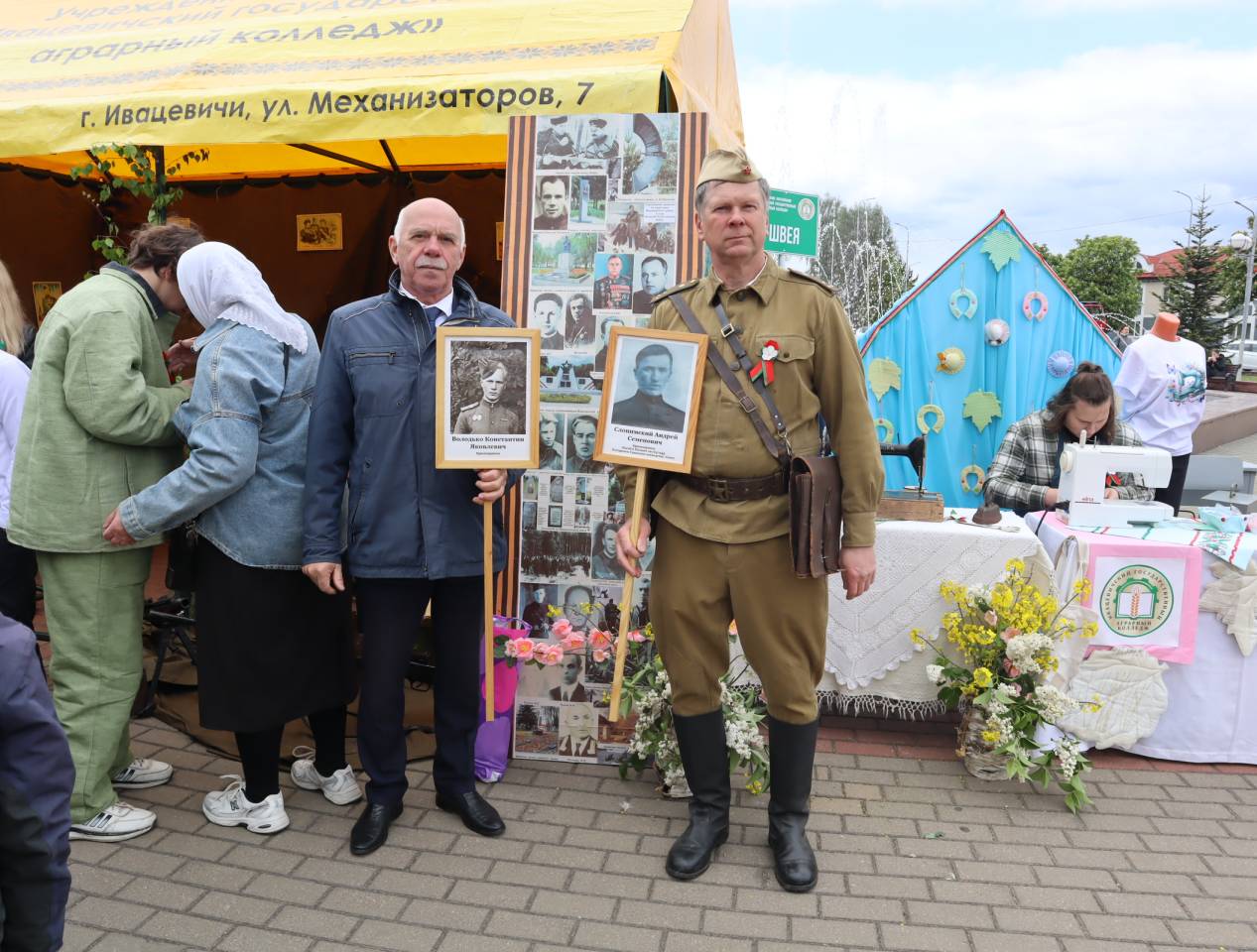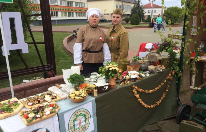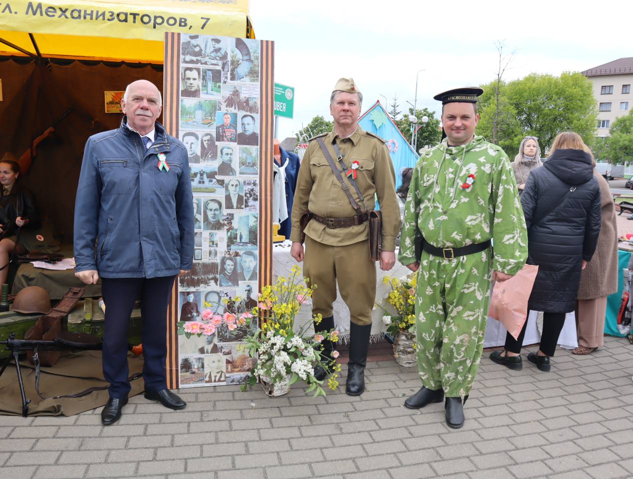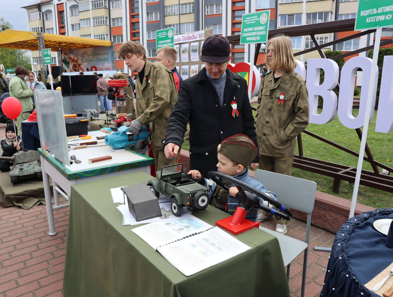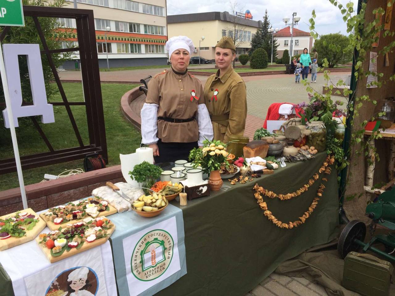 С утра были возложены цветы к памятнику погибшим в годы войны мирным жителям. Далее представители нашего трудового коллектива и учащиеся прошлись в праздничной колонне по главной улице города, присутствовали на митинге-реквиеме «Слава Великой Победе» у памятника в городском сквере Победы. На площади у райисполкома наш колледж организовал интерактивную площадку, на которой всё было оформлено в военной тематике. На ней демонстрировались мастер-классы по профессиям, выставка макетов военной техники. Особой популярностью у посетителей пользовалась наша фотозона, дегустация закусок походной кухни и игры на меткость в уничтожении вражеской техники.
