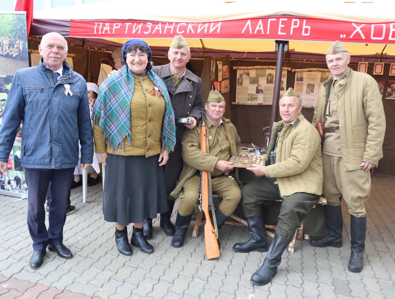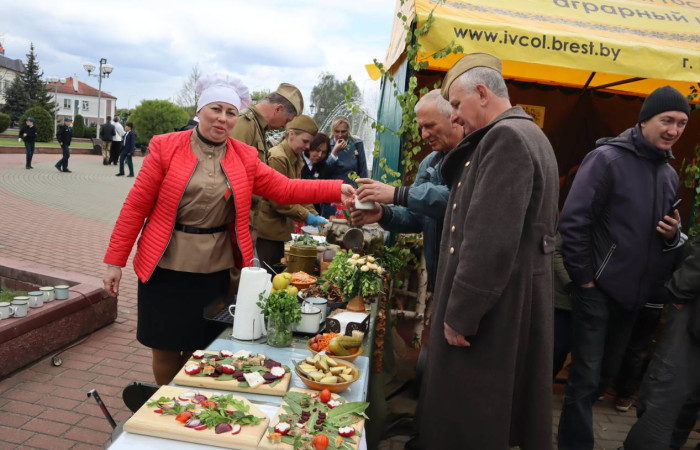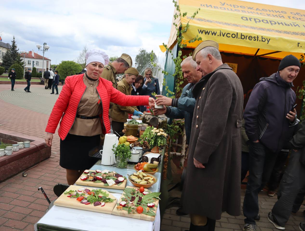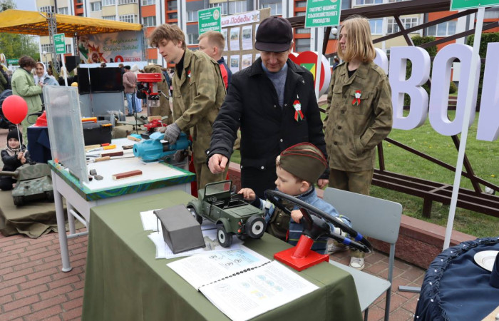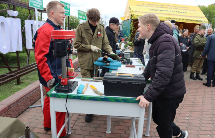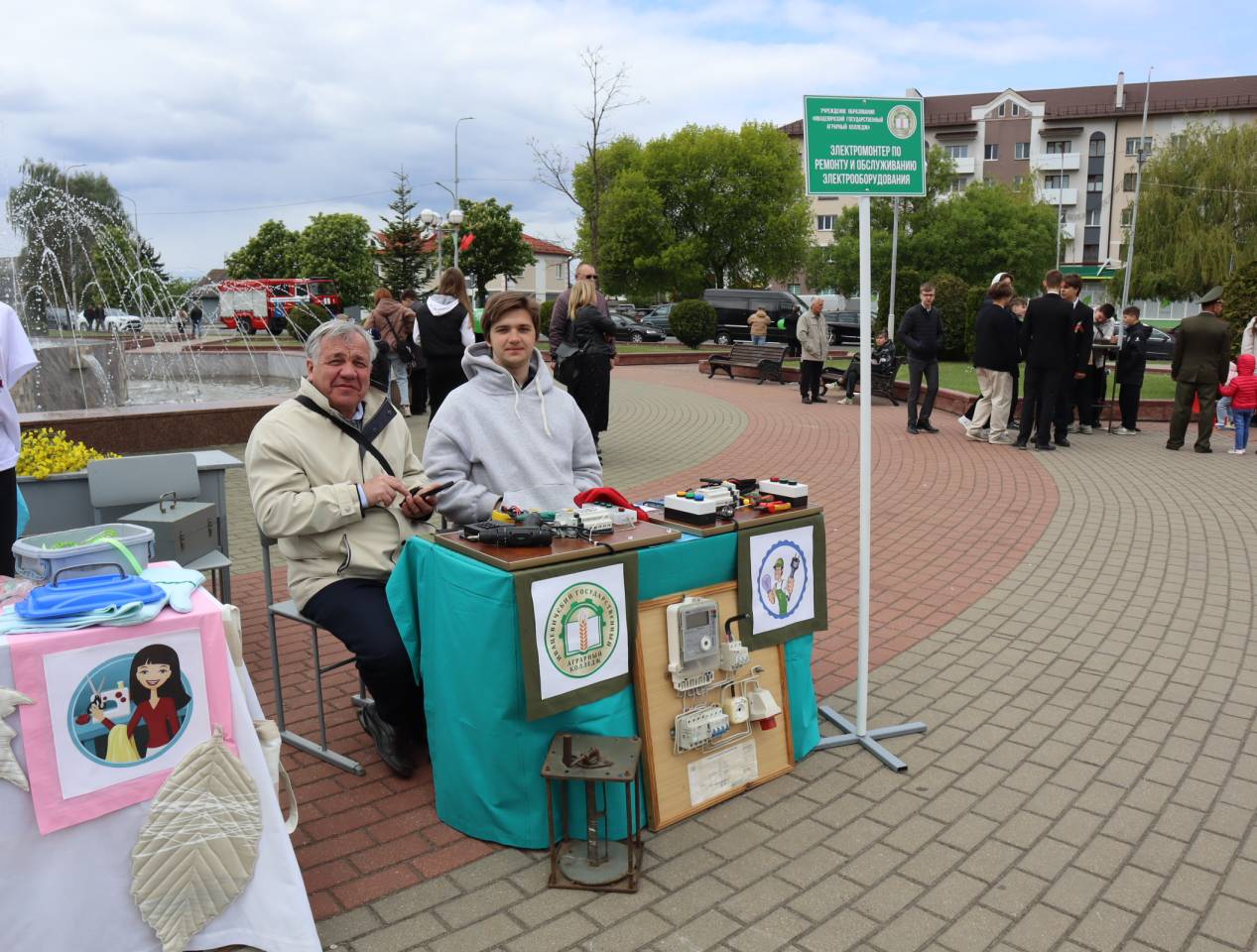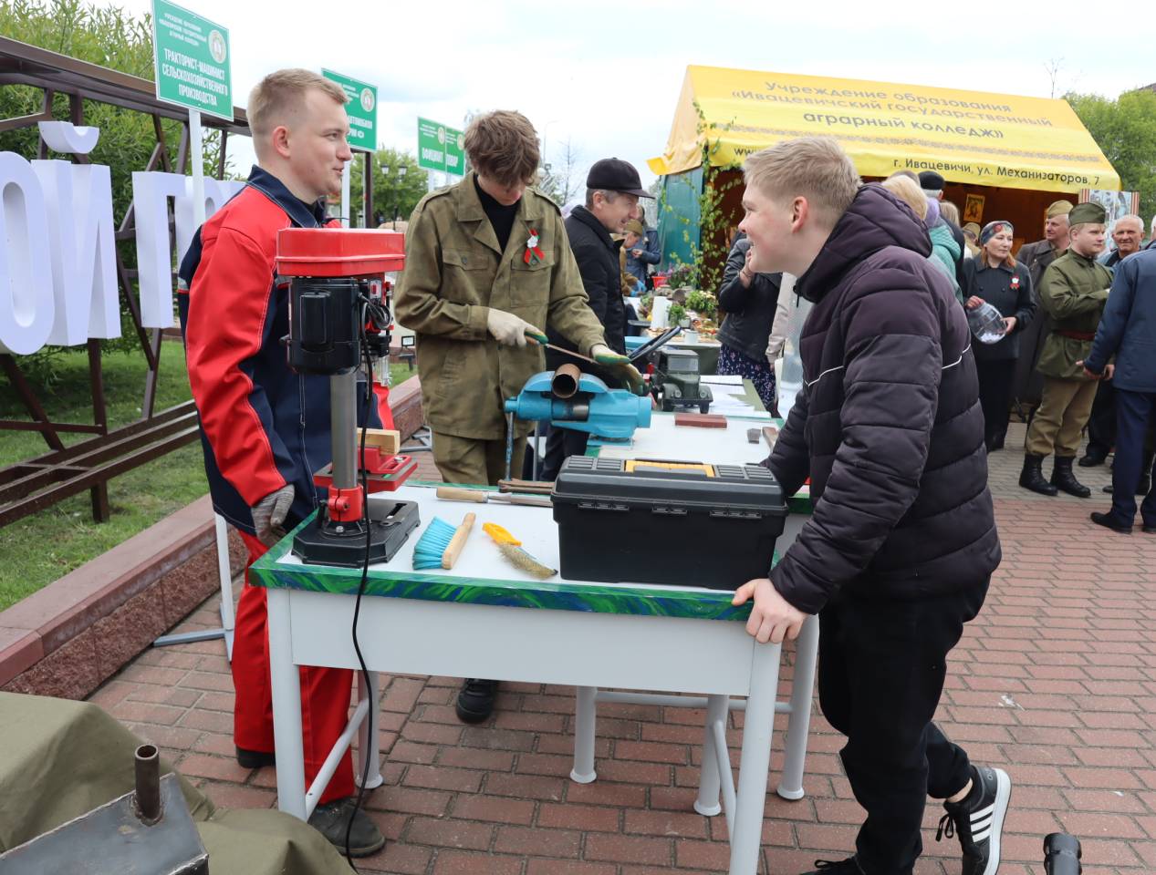 С утра были возложены цветы к памятнику погибшим в годы войны мирным жителям. Далее представители нашего трудового коллектива и учащиеся прошлись в праздничной колонне по главной улице города, присутствовали на митинге-реквиеме «Слава Великой Победе» у памятника в городском сквере Победы. На площади у райисполкома наш колледж организовал интерактивную площадку, на которой всё было оформлено в военной тематике. На ней демонстрировались мастер-классы по профессиям, выставка макетов военной техники. Особой популярностью у посетителей пользовалась наша фотозона, дегустация закусок походной кухни и игры на меткость в уничтожении вражеской техники.