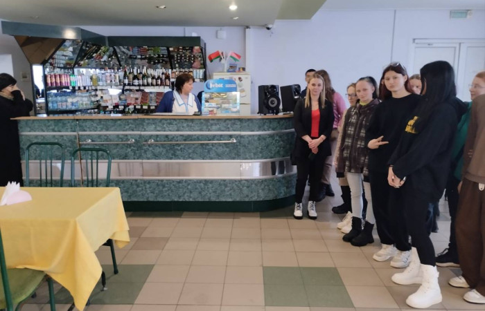 Встретила ребят Букшта Т.М., начальник сектора общественного питания, которая рассказала о концепции заведения, режиме работы, мероприятиях, запрашиваемых гостями, обязанностях производственного персонала. Ребята узнали о том, что на предприятии, кроме обслуживания клиентов, занимаются еще изготовлением полуфабрикатов и 4 видов столовой горчицы. И самое интересное, среди поваров – наш выпускник Егор Тюшкевич.