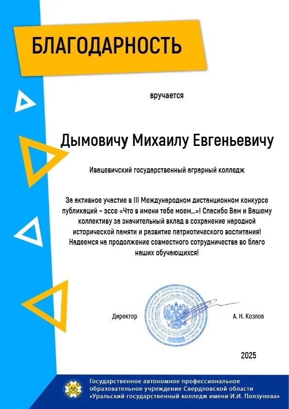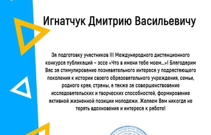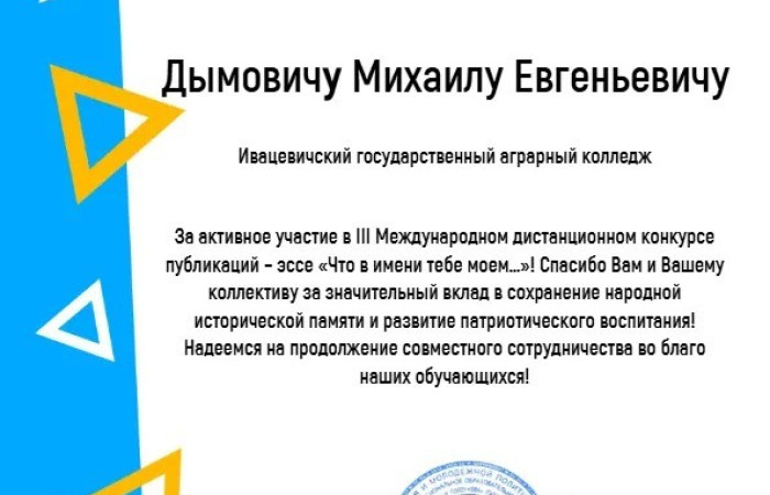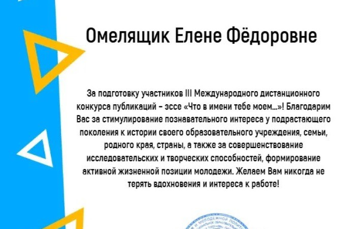 Благодарим учащихся за бережное отношение к истории своего края, своей страны! Благодарим педагогических работников, принявших участие в III Международном конкурсе публикаций — эссе «Что в имени тебе моем…», за значительный вклад в сохранение народной исторической памяти и активное развитие патриотического воспитания молодежи!