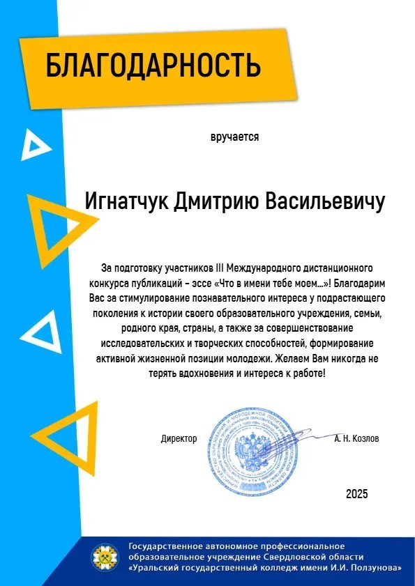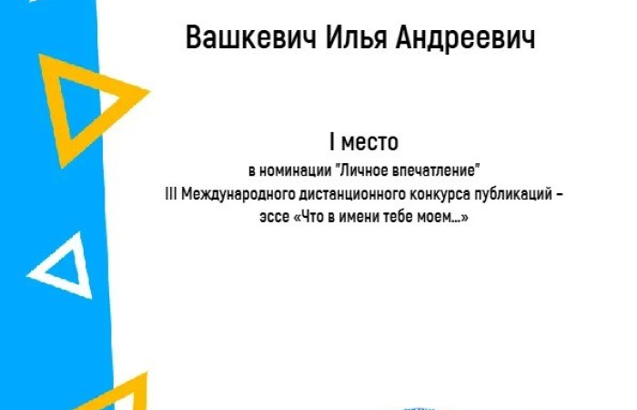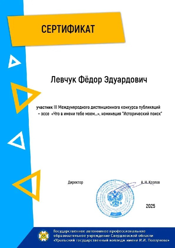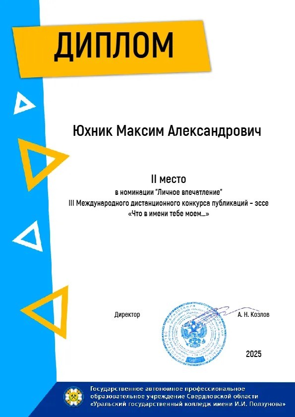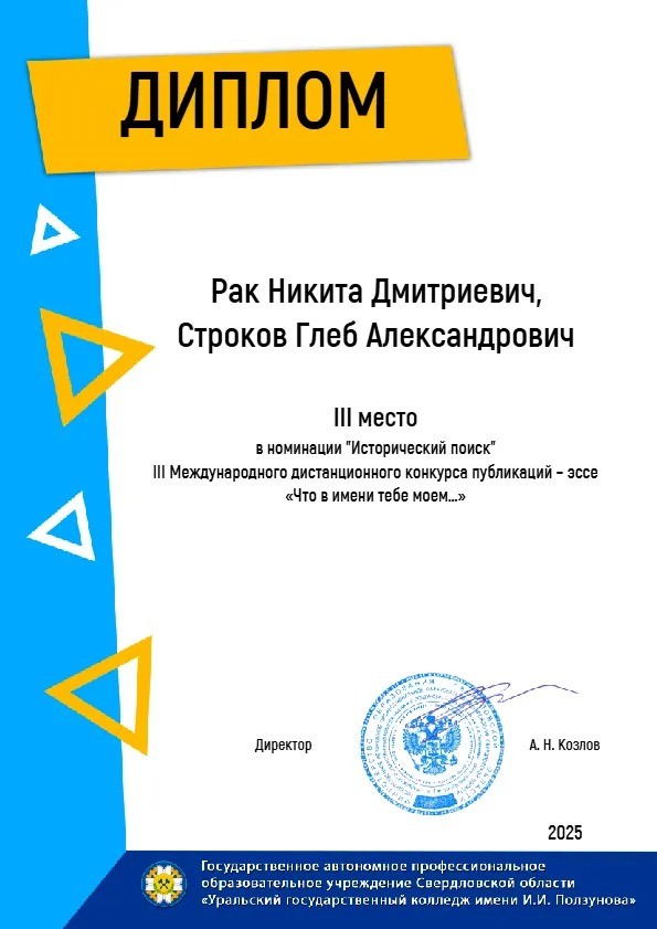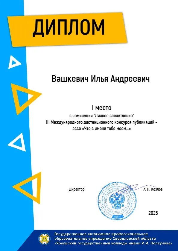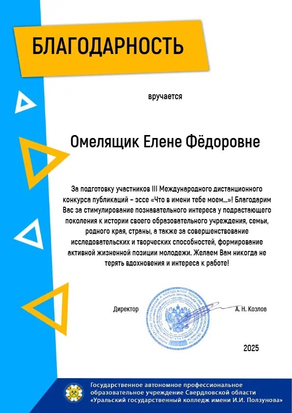 Завершился III Международный дистанционный конкурс на лучшую публикацию-эссе «Что в имени тебе моём…» среди образовательных организаций среднего профессионального образования. В 2025 году в конкурсе приняли участие 294 автора из 81 образовательной организации Российской Федерации, Республики Беларусь, Кыргызской Республики.