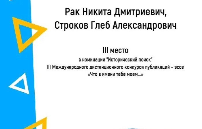 Диплом III степени в номинации «Исторический поиск» — Рак Никита, Строков Глеб, учащиеся Ивацевичского государственного аграрного колледжа (руководитель работы – преподаватель Омелящик Елена Федоровна);
