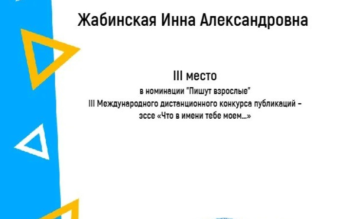 Диплом III степени в номинации «Пишут взрослые» — Жабинская Инна Александровна, методист!