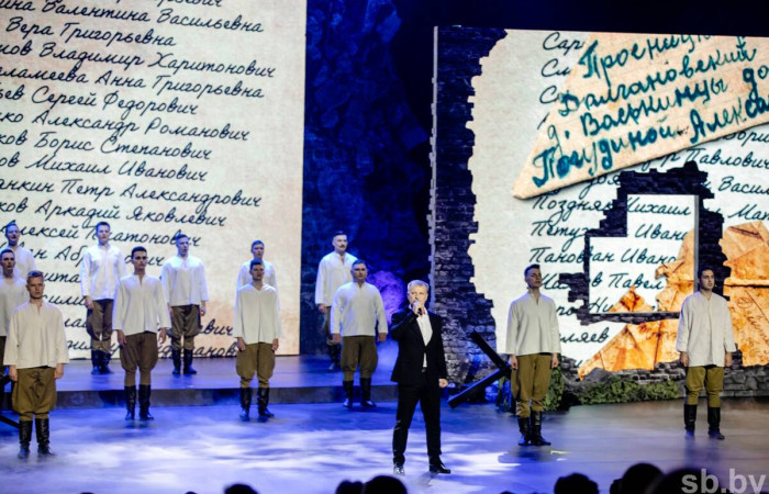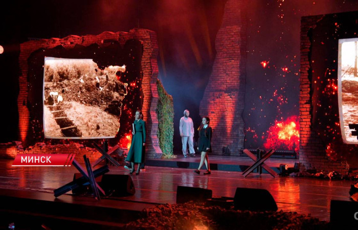 На сцене Дворца Республики сочетались песни, кинохроника, театр, погружая зрителей в далекие времена Великой Отечественной войны.