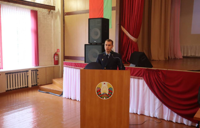 Помощник прокурора Ивацевичского района Литвинюк Ренат Александрович. Ренат Александрович в своем выступлении рассказал не только о категории преступлений, которые наиболее часто встречаются среди несовершеннолетних и, чаще всего, бывают отягощены состоянием алкогольного или наркотического опьянения, но и предупредил об ответственности за совершение преступлений в сфере киберпространства. Особое внимание обратил на ст.370 УК РБ «Надругательство над государственными символами».