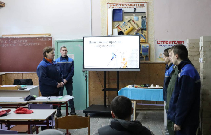 В рамках Недели опытным мастером производственного обучения Чурай Н.А. был проведен открытый урок на тему: «Выполнение простой штукатурки». Учащимся предстояло вслед за мастером показать свои знания и умения по выполнению набрасывания известково-песчаного раствора кельмой (штукатурной лопаткой).