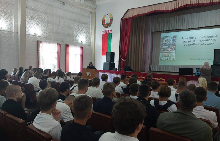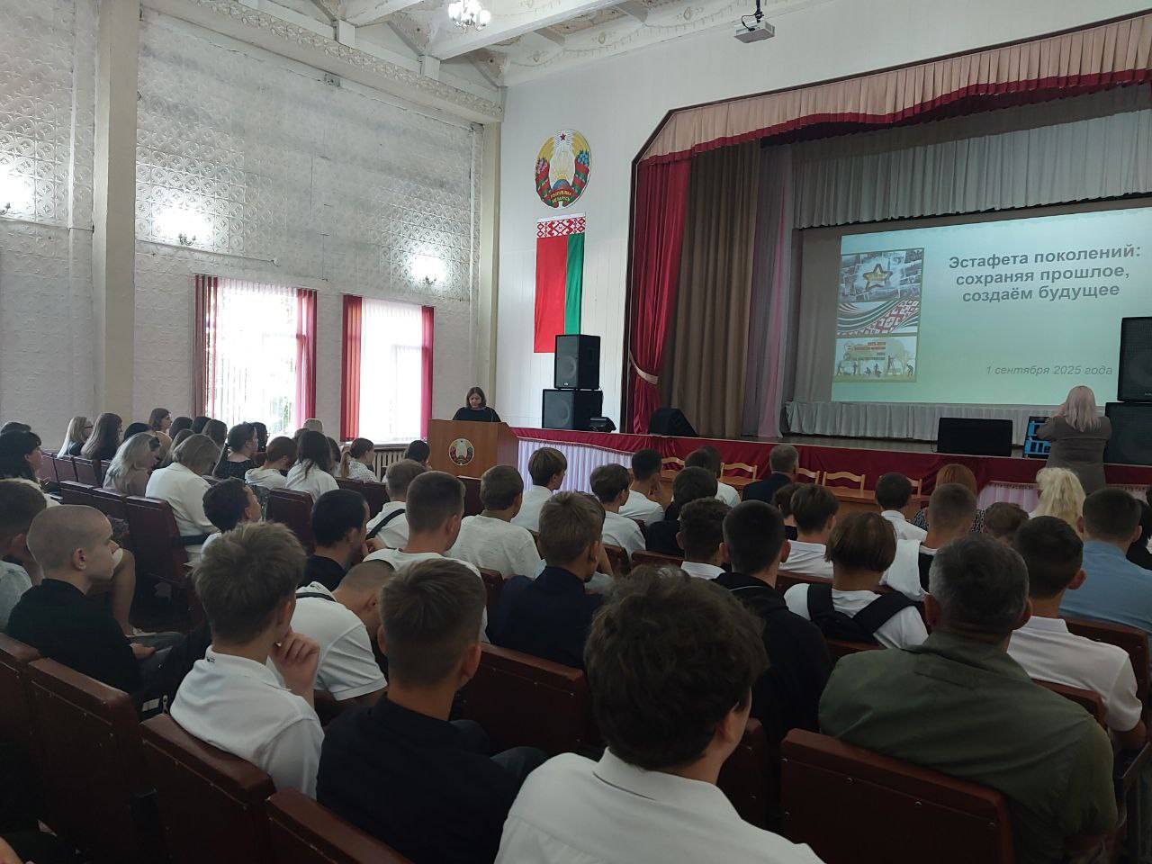 После линейки учащихся первого курса были приглашены в актовый зал, где преподаватель Маметвелиева О.Н. провела для них первый урок под названием «Эстафета поколений: сохраняя прошлое, создаём будущее!».