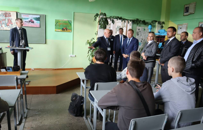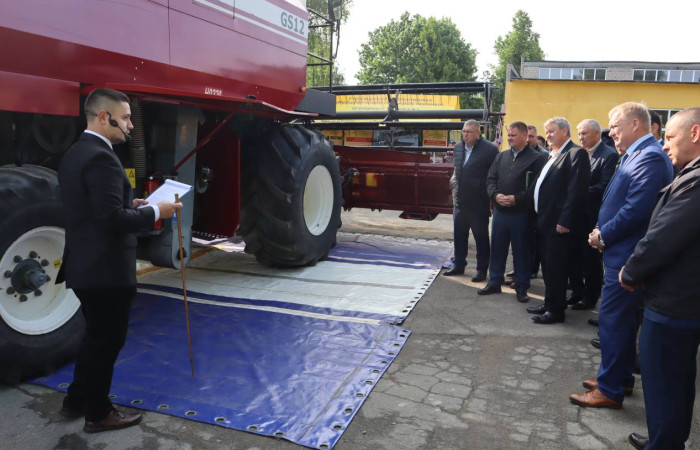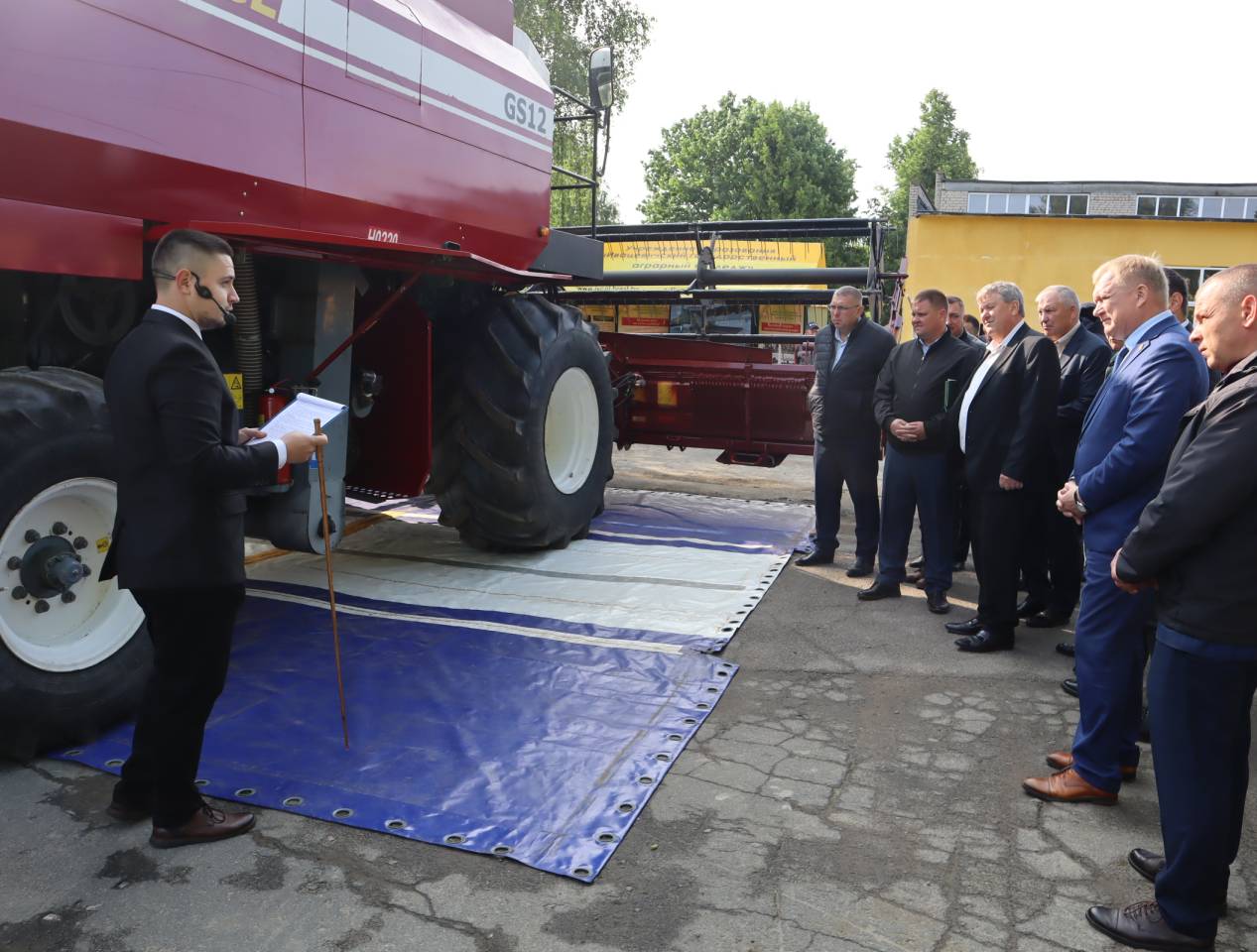 Далее, непосредственно на комбайне, были показаны основные узлы машины, правила технического обслуживания и подготовки к работе. Особое внимание уделялось вопросу минимизации потерь зерна. Мастер производственного обучения Колбаско А.Г. продемонстрировал работу комбайна в стационарных условиях.