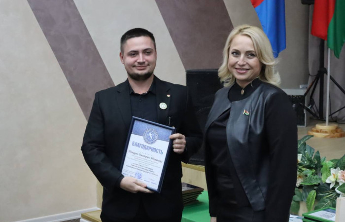 За активное участие в организации студенческих отрядов Первый секретарь районного комитета ОО «БРСМ» Н.Н.Клютко вручила благодарность директору колледжа М.Е.Дымовичу.