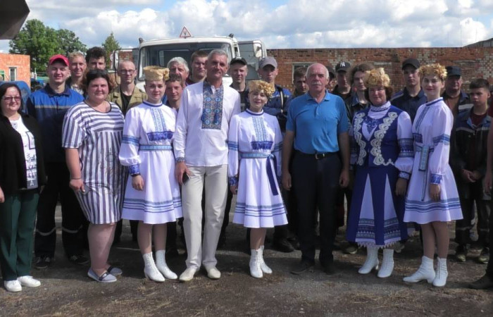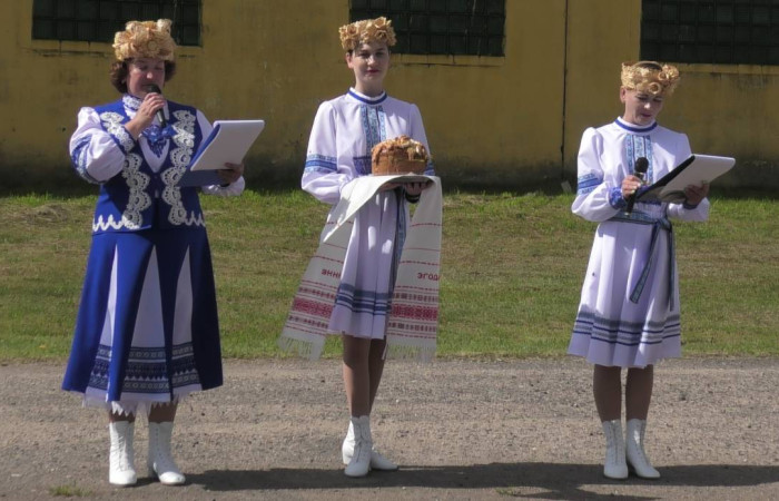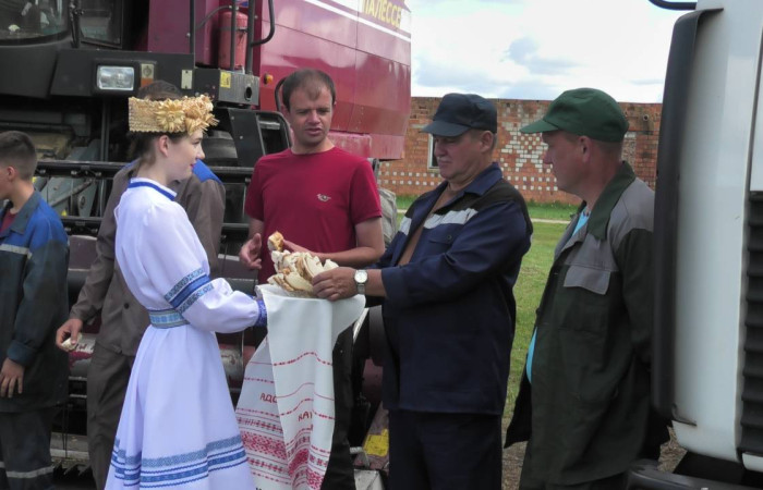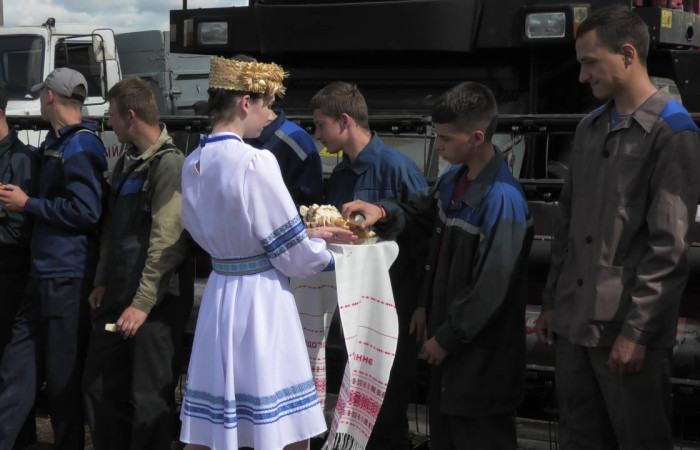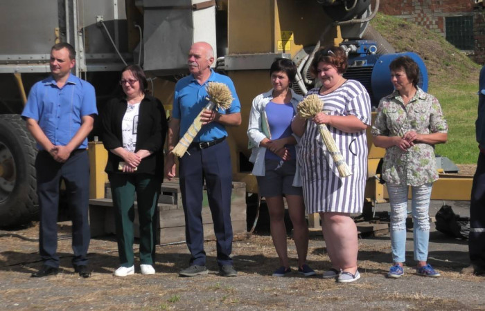 Первый сноп убранных зерновых, перевязанный шелковыми лентами, преподнесли главному хозяину здешних полей – директору лицея Михаилу Евгеньевичу Дымовичу. Он поздравил присутствующих с сегодняшним праздником и выразил самые добрые пожелания участникам жатвы. Второй сноп вручили управляющей учебного хозяйства Ольге Александровне Козел, которая также произнесла напутственные слова и наилучшие пожелания хлеборобам. С праздником всех присутствующих поздравила и председатель профкома лицея Екатерина Николаевна Козловская.