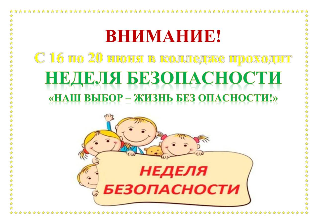 В период с 16 июня по 20 июня 2025 года в колледже проходит Неделя безопасности «Наш выбор – жизнь без опасности!» с целью популяризации знаний правил безопасности жизнедеятельности среди учащихся, воспитанию бережливого отношения к сохранению своего здоровья, жизни и жизни окружающих.