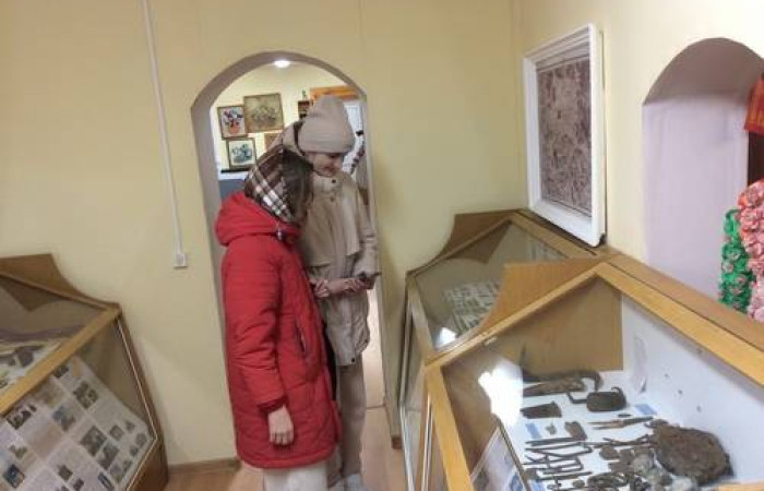 Учащиеся с удовольствием слушали и с любопытством рассматривали экспонаты. Особенно ребятам понравилась экспозиция «История армии», посвященная военным событиям, которые коснулись нашего района. В этом зале представлены выставочные стенды, посвященные Первой мировой войне и Великой Отечественной войне. В витринах - награды и наградные удостоверения, благодарственные письма, личные вещи участников войн. Заинтересовал учащихся макет партизанской землянки. Немалый интерес мальчишки проявили к макетам оружия: пулемёт Максима, ручной пулемёт, Дегтярёва. С автоматом ППШ (пистолет-пулемёт Шпагина) ребята устроили фотосессию.